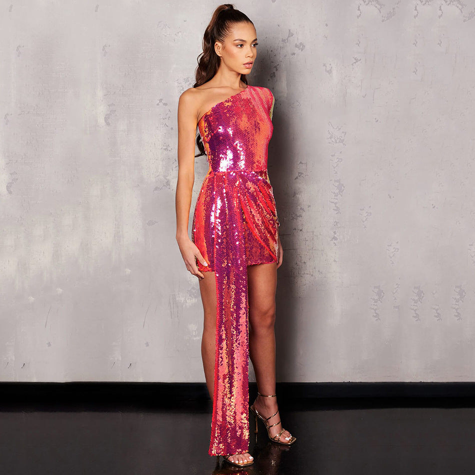 Discover the perfect dress for your next special occasion with our Sequin High Waist Wrap Chest Solid Sequin Long Dress. Made with high-quality polyester fiber fabric and featuring an elegant diagonal collar, this dress offers a unique and stylish look for any event. The short, irregular skirt and conventional sleeves add a touch of sophistication, while the bold red and gold sequins provide a stunning and eye-catching shine. Elevate your wardrobe and stand out from the crowd with this must-have dress.